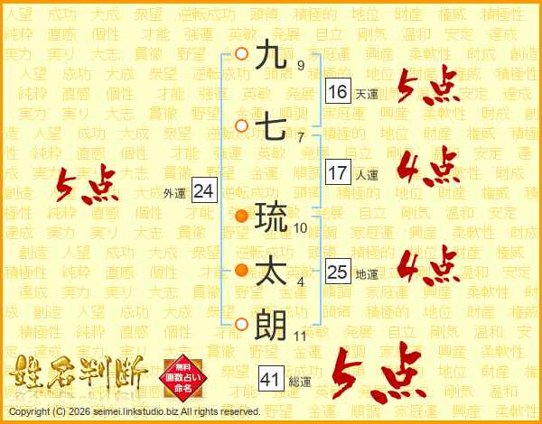 九(9画)七(7画) 琉(10画)太(4画)朗(11画)