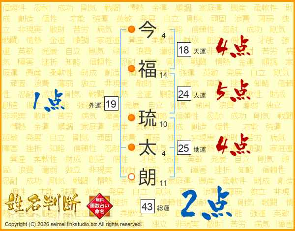 今(4画)福(14画) 琉(10画)太(4画)朗(11画)