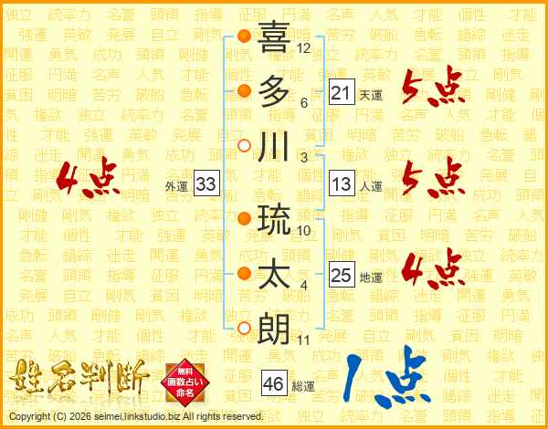 喜(12画)多(6画)川(3画) 琉(10画)太(4画)朗(11画)