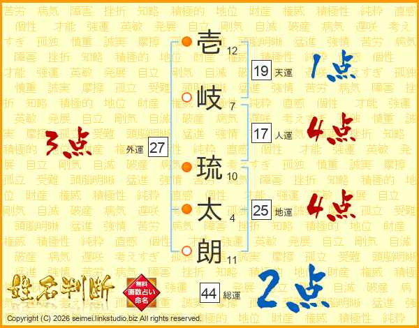 壱(12画)岐(7画) 琉(10画)太(4画)朗(11画)
