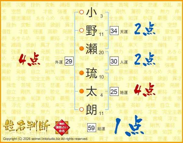 小(3画)野(11画)瀬(20画) 琉(10画)太(4画)朗(11画)