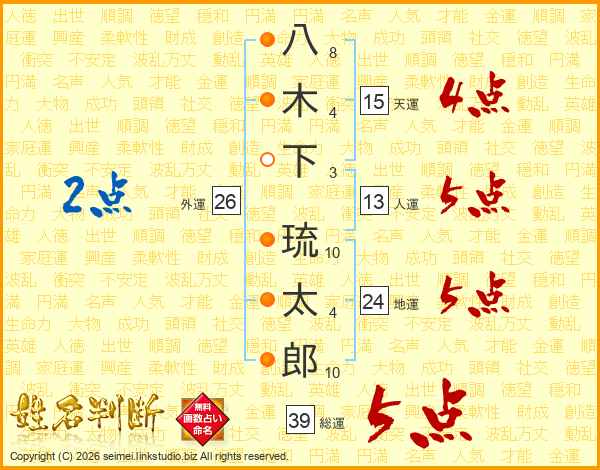 八(8画)木(4画)下(3画) 琉(10画)太(4画)郎(10画)