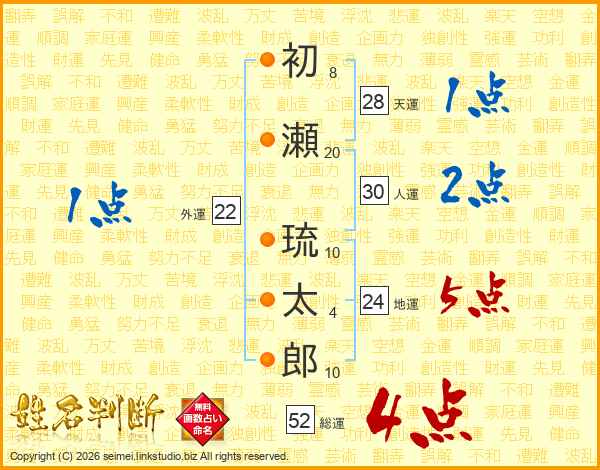 初(8画)瀬(20画) 琉(10画)太(4画)郎(10画)