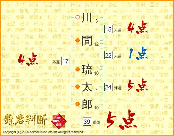 川(3画)間(12画) 琉(10画)太(4画)郎(10画)