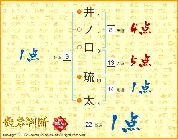 井(4画)ノ(1画)口(3画) 琉(10画)太(4画)