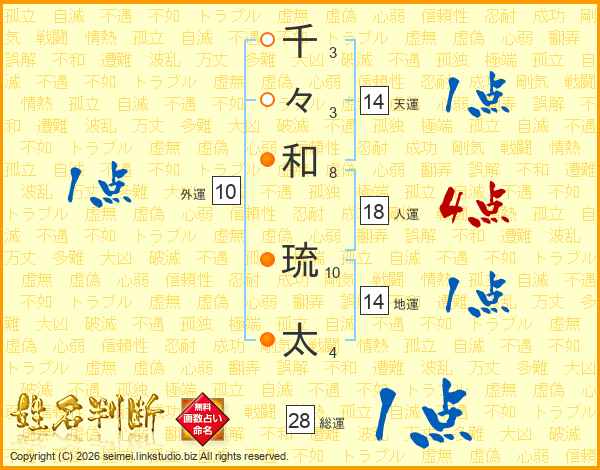 千(3画)々(3画)和(8画) 琉(10画)太(4画)