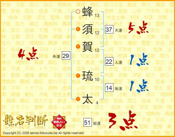 蜂須賀琉太さんの天運は37画の5点!