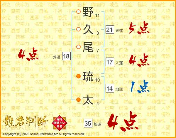 野久尾琉太さんの天運は21画の5点!