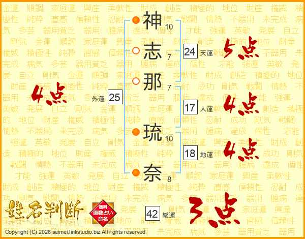 神(10画)志(7画)那(7画) 琉(10画)奈(8画)