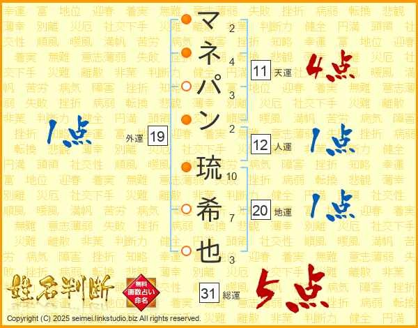 マ(2画)ネ(4画)パ(3画)ン(2画) 琉(10画)希(7画)也(3画)