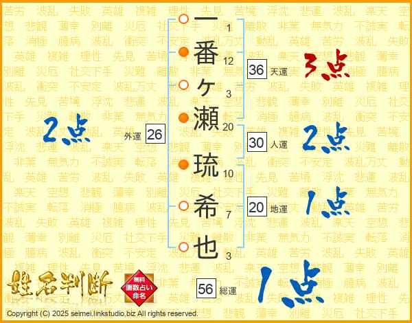 一番ヶ瀬琉希也さんの総運は56画の1点!