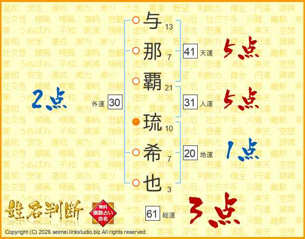与(13画)那(7画)覇(21画) 琉(10画)希(7画)也(3画)