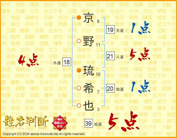 京(8画)野(11画) 琉(10画)希(7画)也(3画)