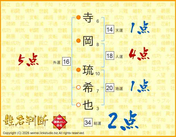 寺岡琉希也さんの総運は34画の2点!