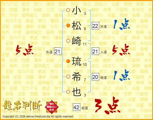 小松崎琉希也さんの人運は21画の5点!