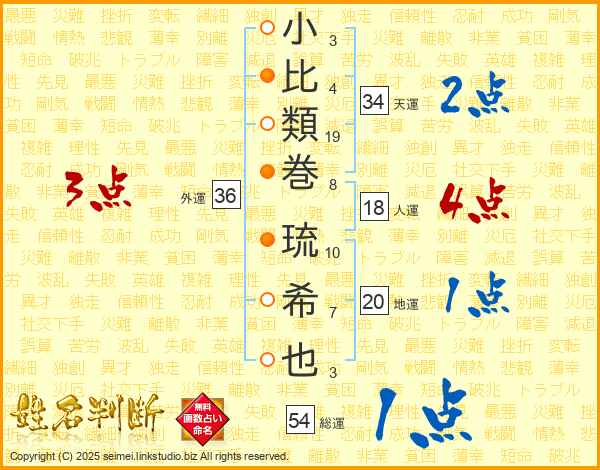 小(3画)比(4画)類(19画)巻(8画) 琉(10画)希(7画)也(3画)