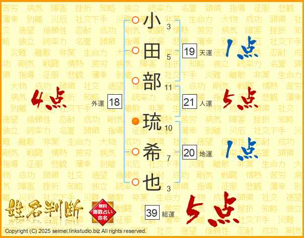 小(3画)田(5画)部(11画) 琉(10画)希(7画)也(3画)