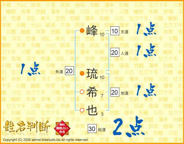 峰(10画) 琉(10画)希(7画)也(3画)