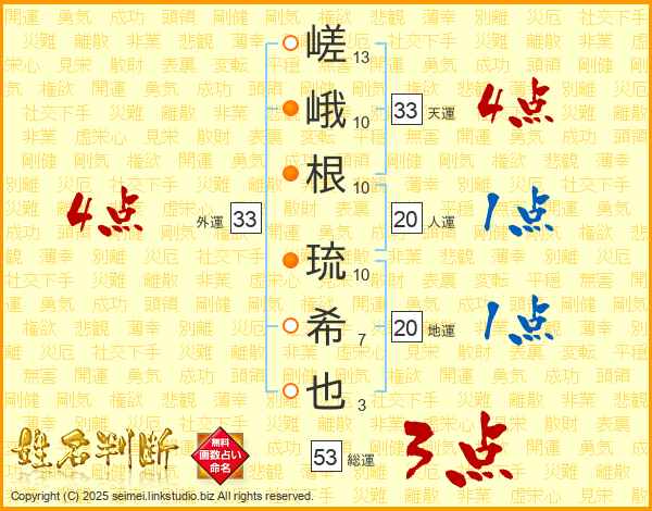 嵯(13画)峨(10画)根(10画) 琉(10画)希(7画)也(3画)