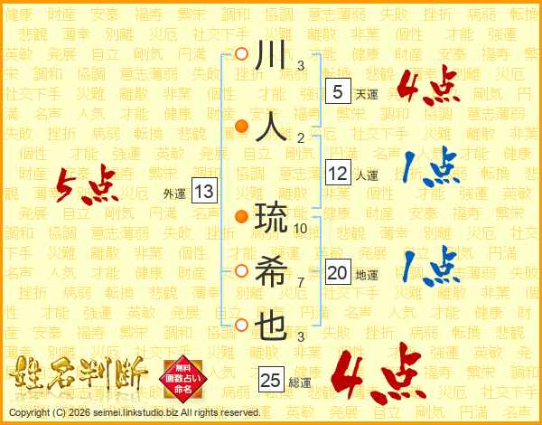 川(3画)人(2画) 琉(10画)希(7画)也(3画)