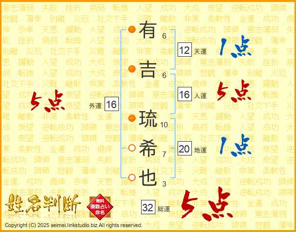有吉琉希也さんの総運は32画の5点!