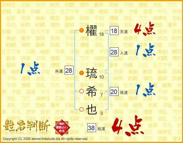 櫂(18画) 琉(10画)希(7画)也(3画)