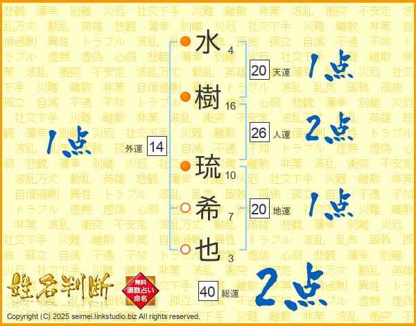 水(4画)樹(16画) 琉(10画)希(7画)也(3画)