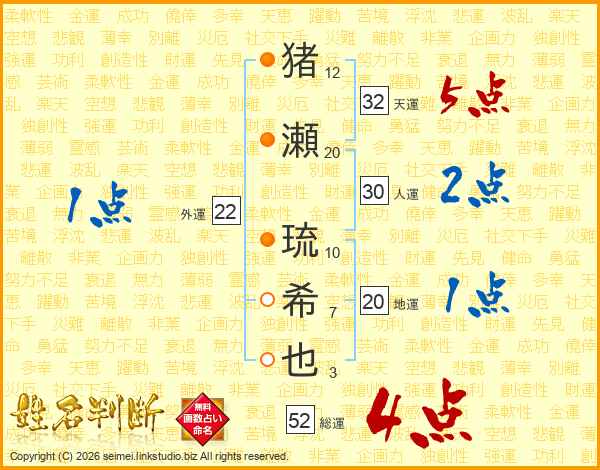 猪(12画)瀬(20画) 琉(10画)希(7画)也(3画)