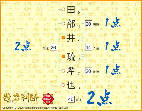 田(5画)部(11画)井(4画) 琉(10画)希(7画)也(3画)