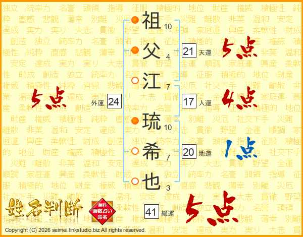 祖(10画)父(4画)江(7画) 琉(10画)希(7画)也(3画)
