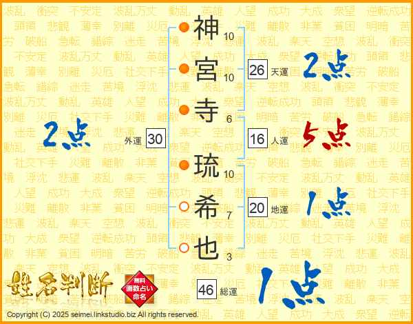 神(10画)宮(10画)寺(6画) 琉(10画)希(7画)也(3画)
