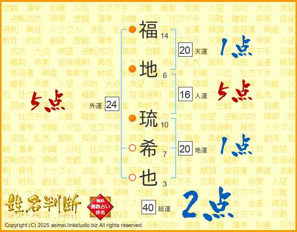 福(14画)地(6画) 琉(10画)希(7画)也(3画)