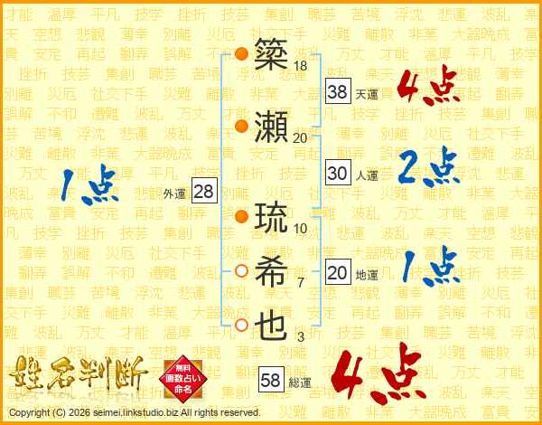 簗(18画)瀬(20画) 琉(10画)希(7画)也(3画)