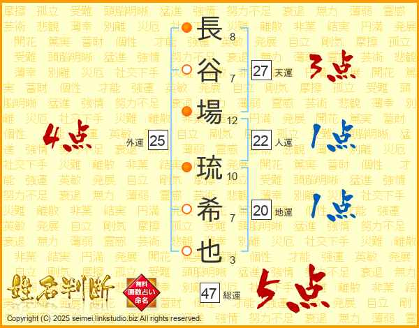 長(8画)谷(7画)場(12画) 琉(10画)希(7画)也(3画)