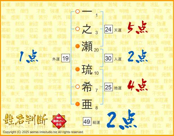 一(1画)之(3画)瀬(20画) 琉(10画)希(7画)亜(8画)