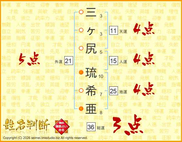 三ヶ尻琉希亜さんの外運は21画の5点!