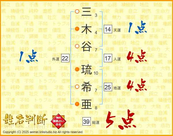 三(3画)木(4画)谷(7画) 琉(10画)希(7画)亜(8画)