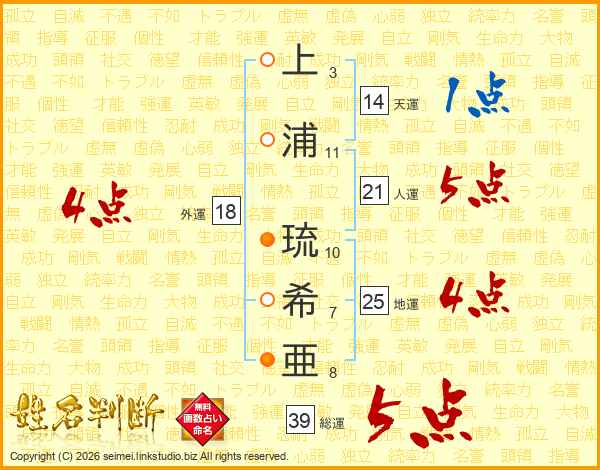 上(3画)浦(11画) 琉(10画)希(7画)亜(8画)