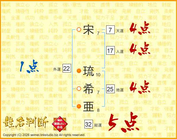 宋琉希亜さんの総運は32画の5点!