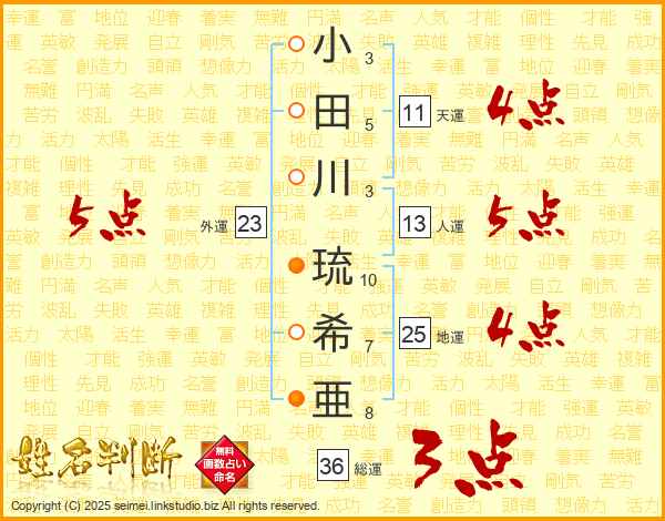 小(3画)田(5画)川(3画) 琉(10画)希(7画)亜(8画)