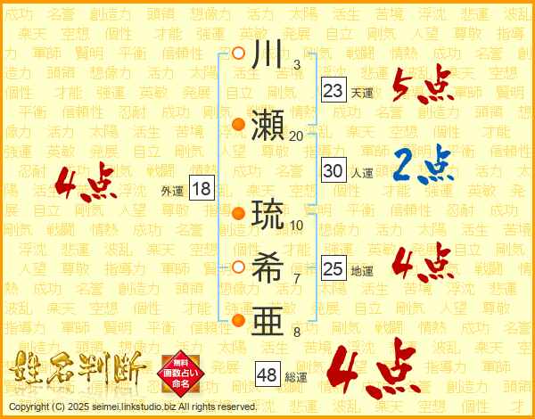 川(3画)瀬(20画) 琉(10画)希(7画)亜(8画)