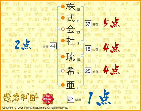 株式会社琉希亜さんの天運は37画の5点!