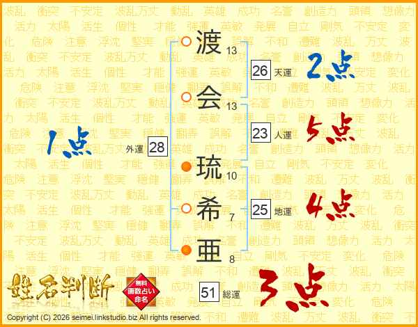 渡(13画)会(13画) 琉(10画)希(7画)亜(8画)
