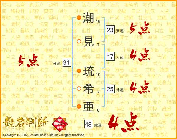 潮(16画)見(7画) 琉(10画)希(7画)亜(8画)