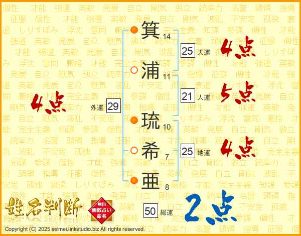 箕(14画)浦(11画) 琉(10画)希(7画)亜(8画)