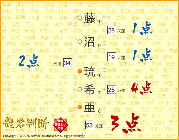 藤(19画)沼(9画) 琉(10画)希(7画)亜(8画)
