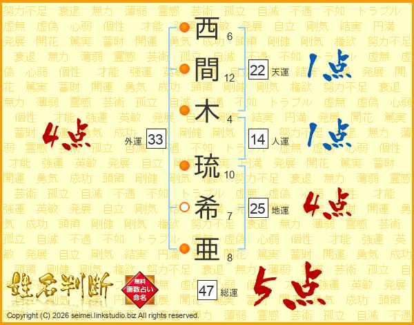 西間木琉希亜さんの総運は47画の5点!