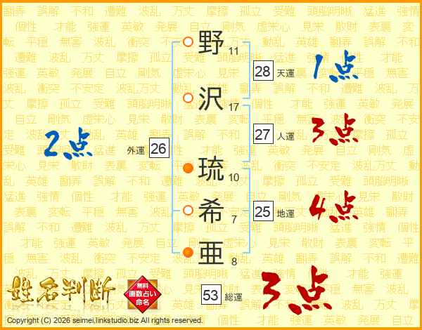 野(11画)沢(17画) 琉(10画)希(7画)亜(8画)