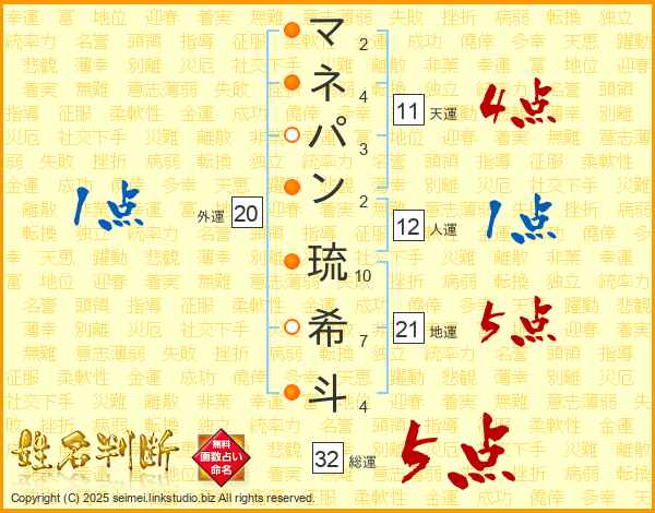 マ(2画)ネ(4画)パ(3画)ン(2画) 琉(10画)希(7画)斗(4画)
