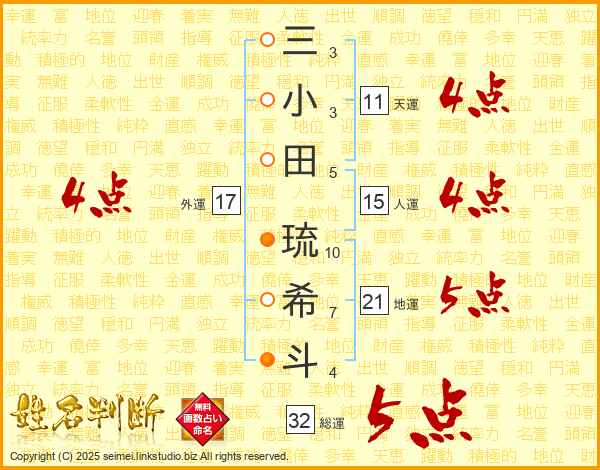 三(3画)小(3画)田(5画) 琉(10画)希(7画)斗(4画)